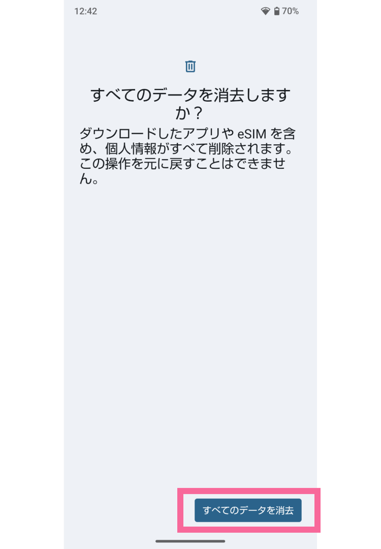 本体パスワードを入力すると、「すべてのデータを消去しますか?」に画面が切り替わるので、「すべてのデータを消去」をタップ