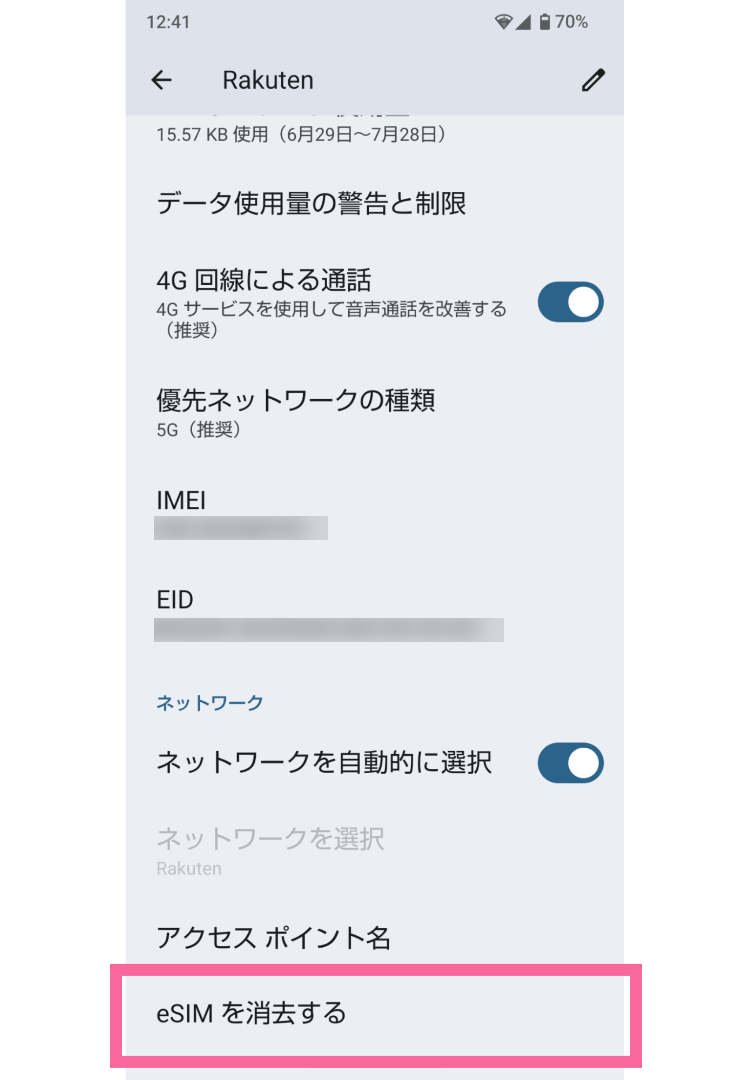 そのため、「eSIM」を使っている場合は「eSIM設定の削除」から、