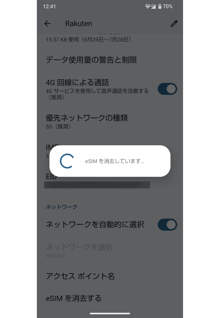 「eSIMを消去しています」と表示されるので、消去完了まで待つ
