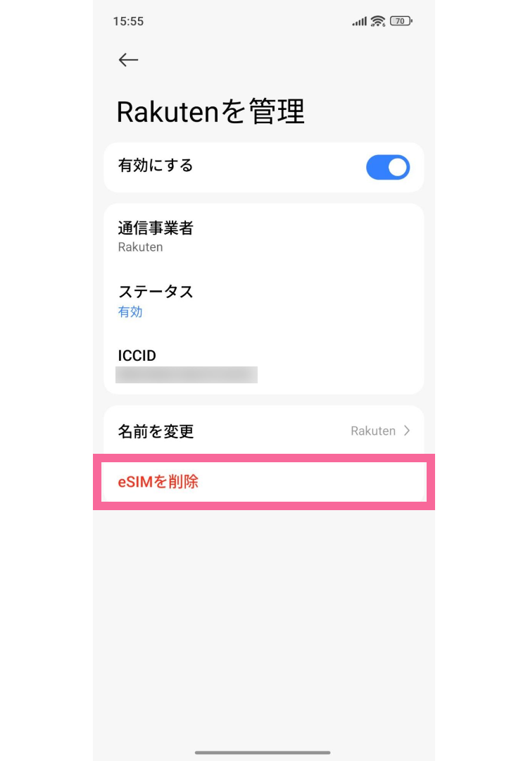 設定しているeSIMをタップ(画像だとRakuten)