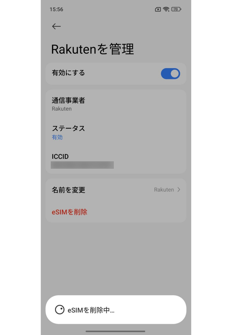 「eSIMを削除中」と表示されるので、消去完了まで待つ