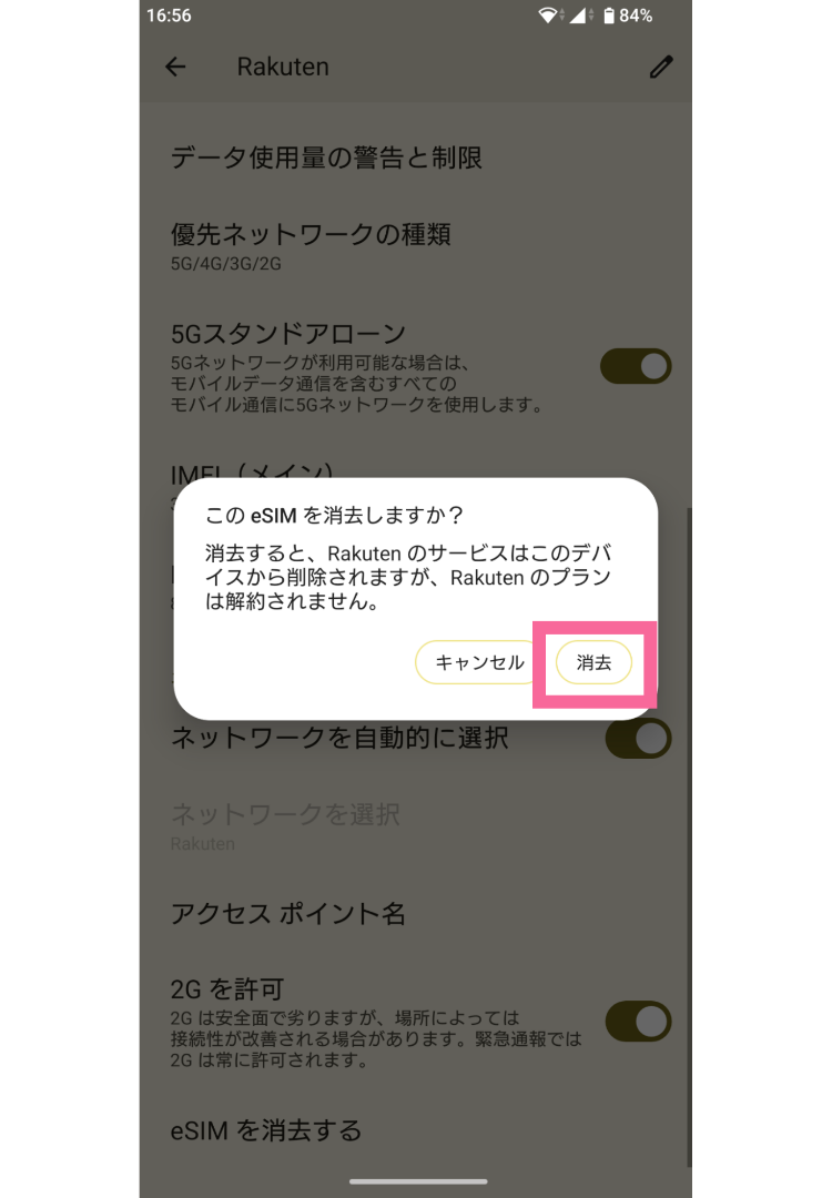 本体パスワードを入力すると、「このeSIMを消去しますか?」とポップアップが表示されるので「消去」をタップ