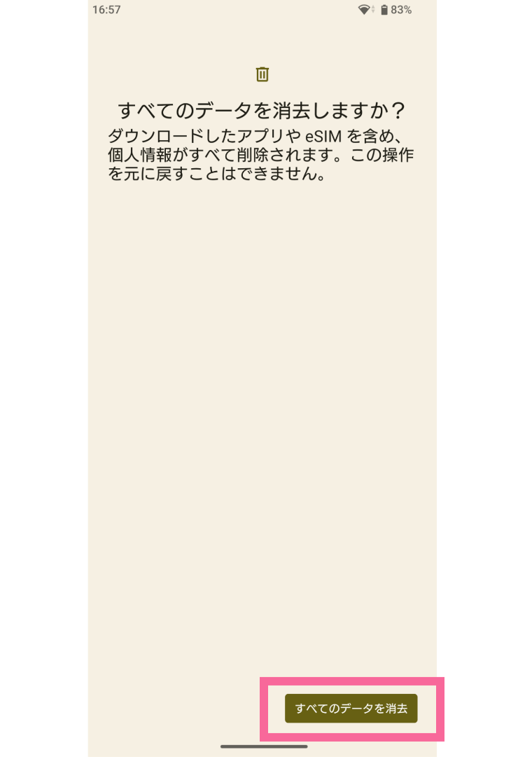 本体パスワードを入力すると、「すべてのデータを消去しますか?」に画面が切り替わるので、「すべてのデータを消去」をタップ